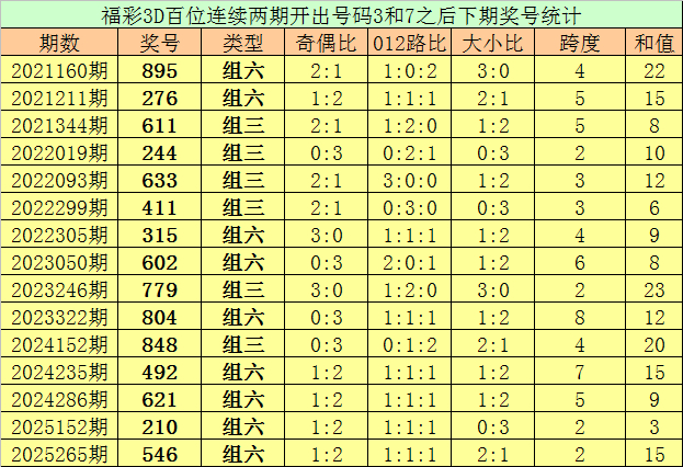 百位号码:承接两期百位出号区分为:3-7,历史上福彩3D承接两期前后区分出号3-7的奖号共出现104次。在百位3-7的奖号征象出当前,近15期下期区分出号:895-276-611-244-633-411-315-602-779-804-848-492-621-210-546;