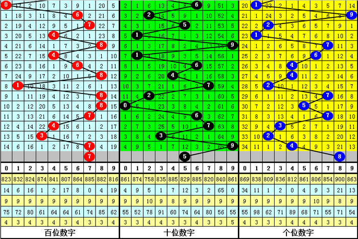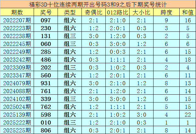 十位号码:前两期十位区分出现奖号3-9,历史上福彩3D承接前后区分开出号码3-9的征象共开出85次。在十位3-9的征象出当前,最近15期其下期区分开出号码:097-230-131-060-285-486-202-560-931-761-339-762-598-010-806;