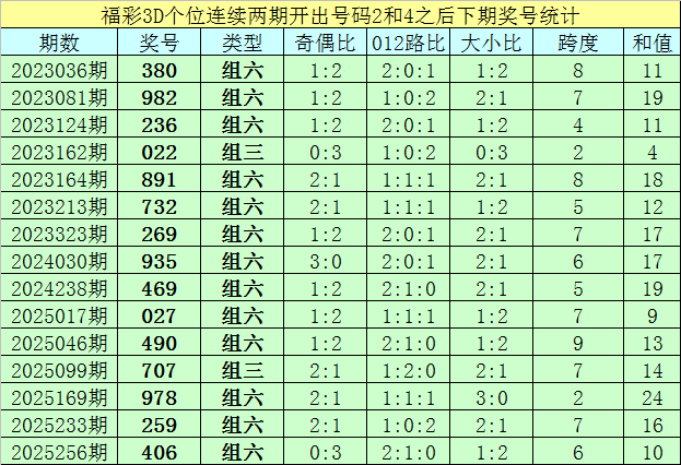 个位号码:最近两期个位开出号码为2-4,在福彩3D历史开奖中,前后两期个位区分开出号码2-4的奖号出现了83次。最近15期个位2-4组合出现之后,其下期奖号区分为:380-982-236-022-891-732-269-935-469-027-490-707-978-259-406;