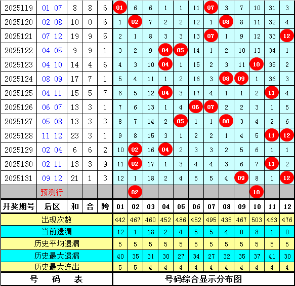 在历史同时开奖中,后区号码和值奇偶为9:8,基本绝顶,本期顺应存眷偶号和值开出,参考和值12。