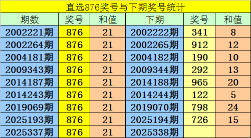 第2025337期3D奖号为:876,历史上该号码直选开出9次,下期号码差异为:341、912、190、292、965、122、798、726。