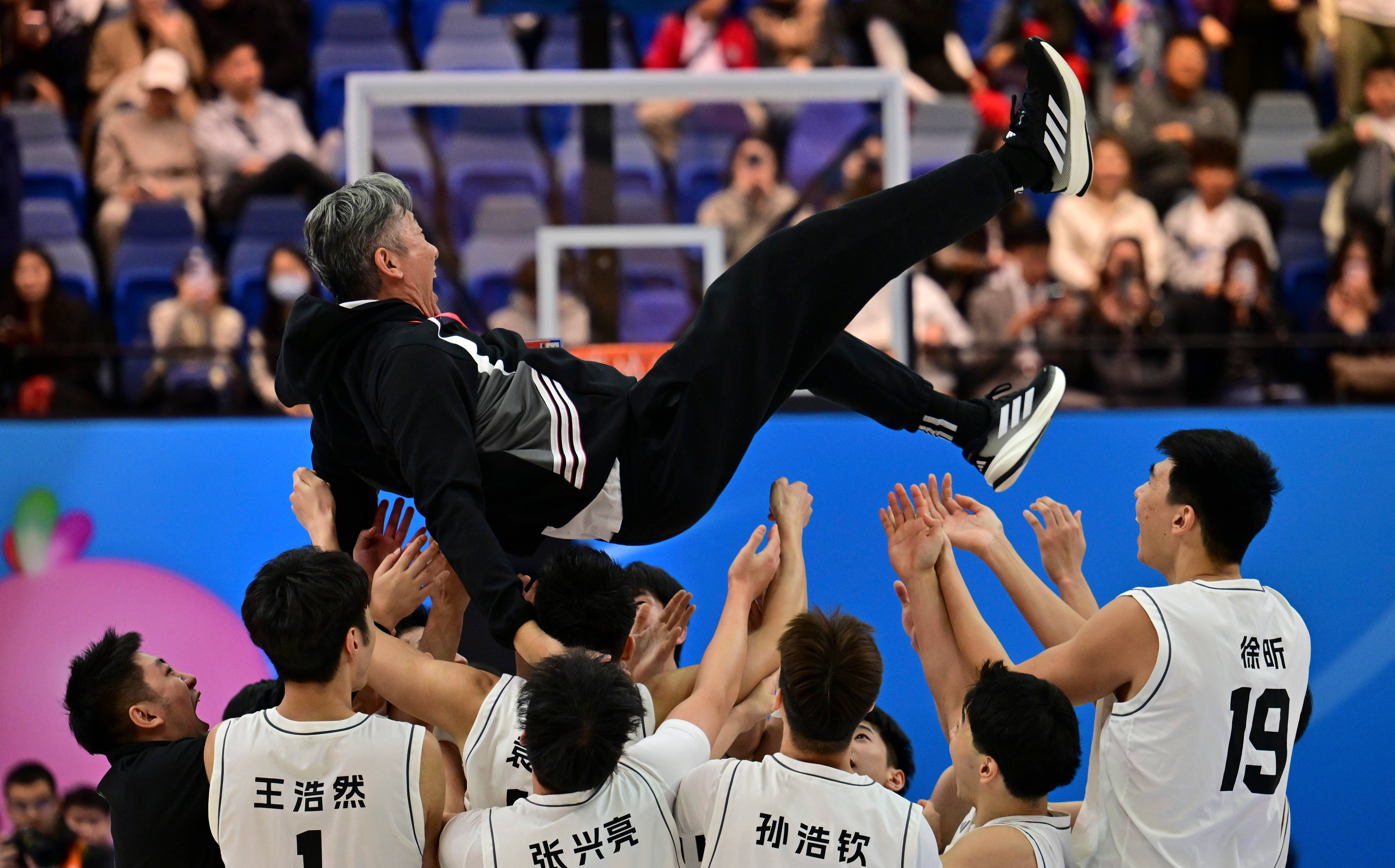 11月20日,广东队球员将主教育郑永刚抛起庆祝夺冠。新华社记者 于洋 摄夺冠后,喜悦的广东队将士们在球场中央把主帅郑永刚高高抛起。