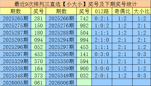 1.枚举三第2026005期奖号开出061,大小直选散布为:小大小,在历史开奖中直选【小大小】散布已开出943期,在前9次直选【小大小】散布中,出现奖号为:281-150-180-094-052-453-370-164-373,组三开出1期,组六开出8期。